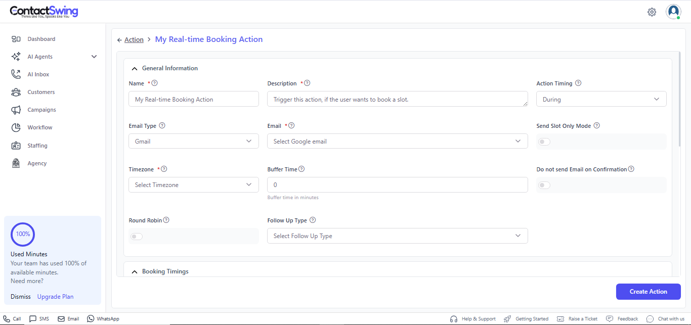 Once all required fields are filled and your Google Calendar is connected, click Create Action to save and activate your real-time booking action.Example real-time booking action setup